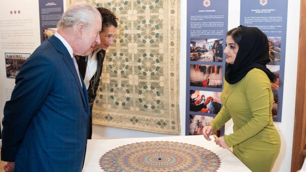 The King and Queen viewed the ‘Craftsmanship and Community: 20 Years of Turquoise Mountain’ exhibition and met artisans who created the collections. The crafts on display include hand-woven carpets and textiles, embroidery, jewellery, hand-blown glass, woodwork, ceramics, tilework, stonework, miniature painting and lacquerware. Their Majesties were shown the exhibition by Shoshana Stewart, President of Turquoise Mountain and Rory Stewart, Founding Director.